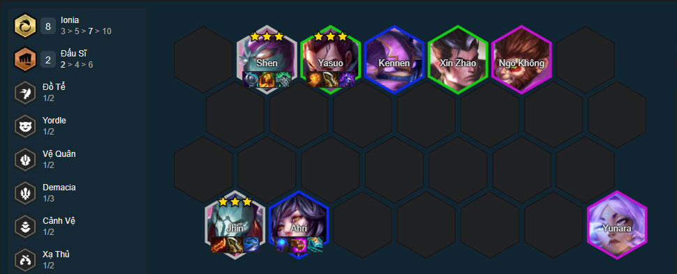 Đội hình Ionia DTCL mùa 16Cách chơi đội hình Ionia DTCL mùa 16 mới nhất gồm: Shen, Kennen, Sett, Ngộ Không, Yone, Yunara, Ahri, Xin Zhao, Jhin và Yasuo.